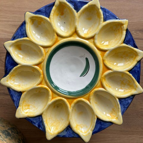 med fordybninger til 10 stk æg og i midten kan der placeres salt og peber på de 2 cirkler.