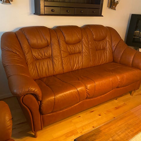 Lædersofaer i god møbelsnedker konstruktion med kraftigt læder, sofabord i børstet eg Chr4 model røgfarvet glasplade følger med.