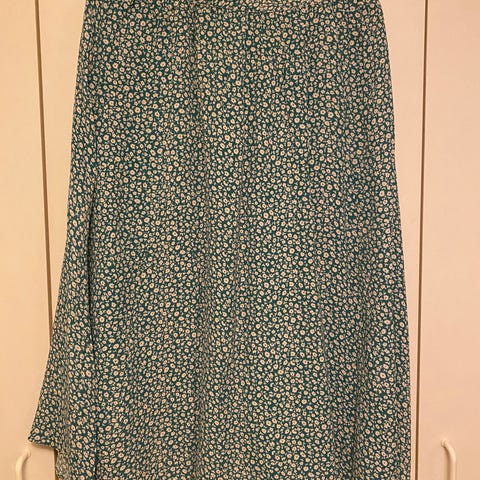 Fin nederdel fra Moliin Copenhagen. Er syet i "etager". Elastiklinning med snor i taljen. Måler 35 cm x 2 i livet. Fra livet og ned måler kjolen 76 cm. Der er hvidt for i nederdelen. Materiale polyester og viskose.