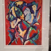 Farverig abstrakt plakat i dybe nuancer af blå, rød og gul, indrammet med paspartout og sølvramme,Bemærk at mail, chat og beskeder ikke besvares, og varen skal købes på knappen "Gå til varen"