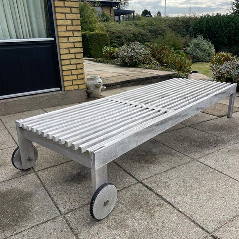 Sælger denne solvogn i massivt kerneteaktræ fra Furneo med grå hynde. Den har justerbart ryglæn, så du kan tilpasse liggepositionen efter behov, og hjul bagtil gør den nem at flytte rundt i haven eller på terrassen.