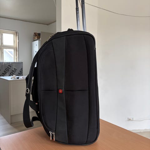 Lækker kvalitets rejsetaske med hjul, teleskop håndtag, bærehåndtag og 5 rum. Kan anvendes både som skuldertaske, da der er en kraftig skulderrem med eller som trolley, da den har håndtag og hjul. Lavet af kvalitets tekstil, forstærket med plast i udsatte steder.