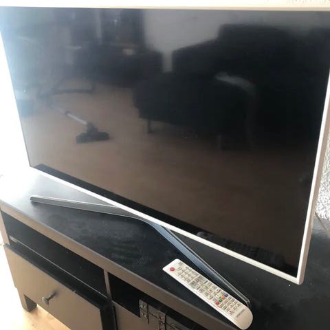 Samsung buet tv i sort. Skærmen fremstår som et buet fladskærms-tv egnet til placering på tv-møbel eller vægophæng, afhængigt af hvilket beslag der anvendes. Tv’et kan bruges til almindelig tv-visning, streaming og tilslutning af eksterne enheder som spillekonsoller og medieafspillere via de tilgængelige porte på bagsiden (ikke vist i detaljer på billederne). Størrelse, modelbetegnelse og opløsning fremgår ikke af oplysningerne og bør kontrolleres af køber ved behov.