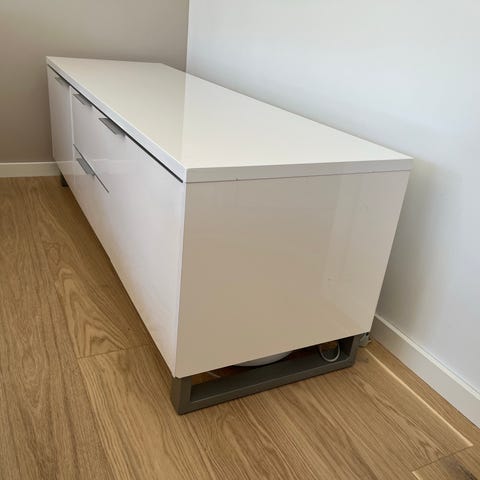Den har to låger og tre skuffer, skufferne fungerer fint og man skal skubbe for at åbne dem.