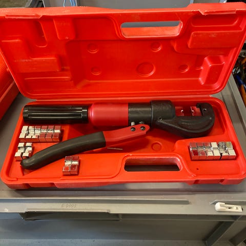 Pressbak til presstang, mærket 16-40 mm. Egnet til presning af rør eller fittings i området 16 til 40 mm. Passer til kompatible presstang-systemer og bruges typisk til VVS- og installationsarbejde. Håndtag med blå greb for bedre håndtering under brug.