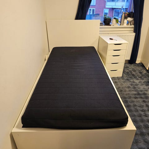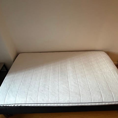 Jysk seng med madras. Træseng med rektangulær ramme og madras i lys farve. Egnet som enkeltseng i soveværelse, gæsteværelse eller ungdomsværelse. Sengen står på ben, så der er mulighed for opbevaring under sengen afhængigt af højde på rammen. Velegnet til almindelig daglig brug som soveplads.