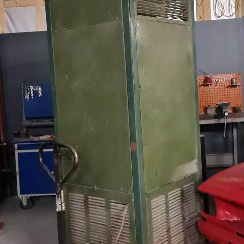 Industriel gulvstående varmluftsblæser i grønmalet metal. Enheden er høj og rektangulær med luftindtag og -udtag via gitre på sider og bund. På bagsiden ses el-tilslutning, styringskomponenter og rund luftstuds til tilkobling af kanal eller slange. Velegnet til opvarmning eller ventilation i værksted, lager eller andre industrielle lokaler, hvor der er behov for kraftig luftcirkulation og varmefordeling. Enheden kræver fast elinstallation og passende plads omkring for luftgennemstrømning.der skal monteres et oliefyr