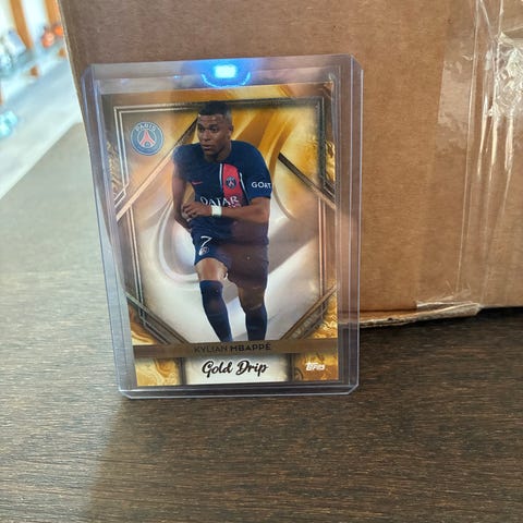 Nummerede til /375 Topps Kylian Mbappé fodboldkort. Samlekort med motiv af Kylian Mbappé i fodboldtrøje. Kortet har en pink og guld farvet forside med stort bogstavmotiv og spillerens navn angivet nederst. Egnet til samling og opbevaring i plastlommer eller mapper til samlekort.