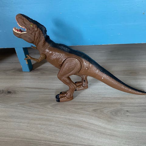 Dinosaur legetøjslegebane med flere etager og integreret stor grøn dinosaurfigur på toppen. Legebanen er udført i plast i grønne, beige og orange farver og indeholder blandt andet rutsjebaner, hegn og detaljer som dinoskelet-dele. Egnet til leg med små biler eller figurer, hvor barnet kan køre eller føre dem gennem de forskellige niveauer og forhindringer på banen.