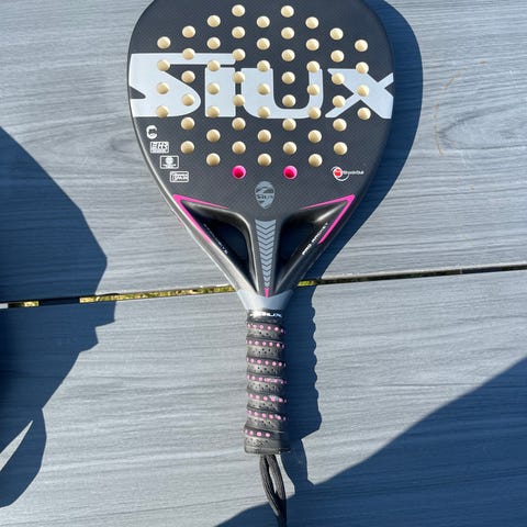 Siux Electra ST2 Stupa Control 2023 padelbat. Battet har rund hovedform med ru overflade for spin. Et bat for kontrol med stort sweet spot og håndtag med ShockOut-dæmpning. Kulfiber ramme og overflade. EVA-kerne. Rammebeskytter. Nyt grip. Vægt 370-380g. Kun brugt ganske få gange og sælges pga. skade.