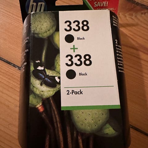 HP 338 blækpatron 2-pack sort. Pakken indeholder to sorte HP 338 blækpatroner, egnet til kompatible HP-printere. Patronerne er beregnet til sort tekst- og dokumentudskrivning. Oplysninger om kompatible printermodeller og kapacitet fremgår af emballagen fra producenten.