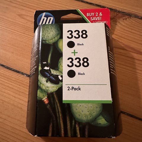 HP 338 blækpatron 2-pack sort. Pakken indeholder to sorte HP 338 blækpatroner, egnet til kompatible HP-printere. Patronerne er beregnet til sort tekst- og dokumentudskrivning. Oplysninger om kompatible printermodeller og kapacitet fremgår af emballagen fra producenten.