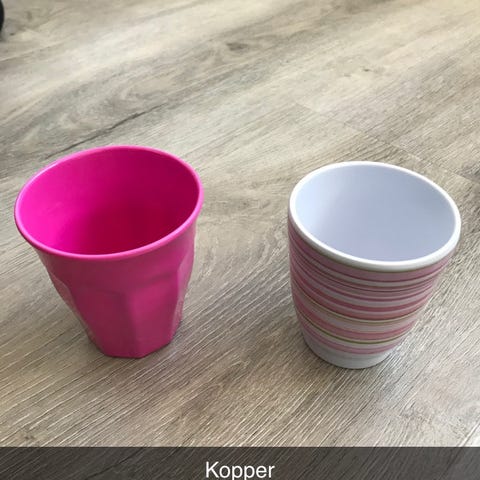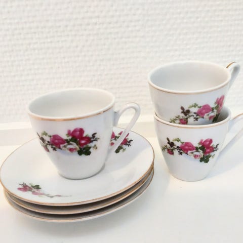 Porcelæn, 4 dukke/små pige kopper, 4 gamle/antikke kopper - den mindste (den med sølvkanten) måler i højden 4,4 cm. - dia. 4 cm. - de 2 store (dem på fødder) - højde 4,5 cm. - dia. 7,5 cm. - alle 4 hele og i orden - guld- og sølvkant lidt slidt.