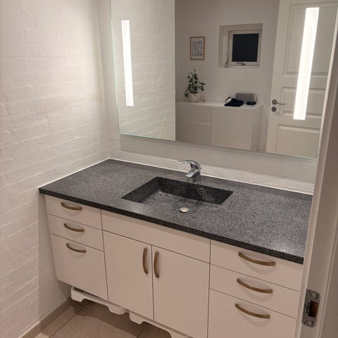 Badeværelsesmøbel inkl. blandingsbatteri fra Grohe, spejl og højskab.