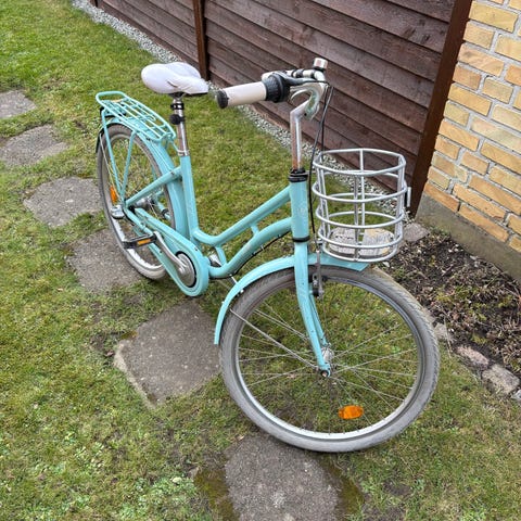 Mustang børnecykel 20" i pink. Cyklen har lav indstigning, fastmonteret frontkurv i metal, bagagebærer, støtteben, skærme og reflekser på hjulene. Sadel og håndtag er i brun farve. Velegnet som hverdagscykel til barn, der passer en 20" cykelstørrelse svarende til 6-8 år. Skal afhentes.