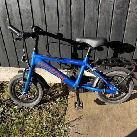 Winther 100 børnecykel med 10" hjul i rød/sølv farve. Cyklen har lav indstigning, fastmonteret bagagebærer, støtteben, skærme og forkurv i plast. Egnet til mindre børn, typisk som første cykel med pedaler. Styret har håndtag med endestop, og sadlen er justerbar i højden for tilpasning til barnets størrelse.