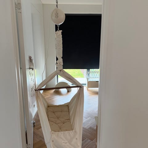 Afstiverbund fra Moonboon samt karmbeslag medfølger. Den er nyvasket efter anvisningerne og fungerer upåklageligt. Der er ikke været uheld i den. Røg- og dyrefrit hjem.