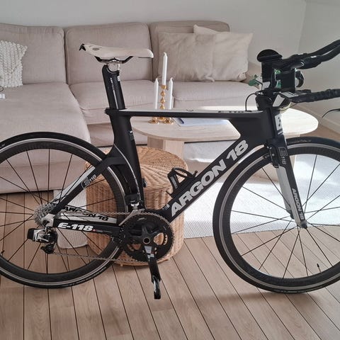 Sælger en Argon 18 E-119 triathloncykel i størrelse M. Cyklen vurderes til ca. 2014-model (baseret på mærkning på stel og komponentniveau).