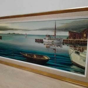Ørbech maleri med afbildning af kystlandskab. Motivet viser en strandeng med køer i forgrunden, både ved kysten og hav i baggrunden under let skyet himmel. Maleriet er rektangulært i bredformat og indrammet i en træramme med lys inderliste. Signatur "Ørbech" ses i nederste venstre hjørne. Velegnet som vægdekoration i stue, kontor eller sommerhus med interesse for landskabs- og kystmotiver.