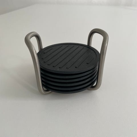 8 coastere og 1 holder. Sort og rustfrit stål. Glasbrikker. Glasbakker. Bordskånere.