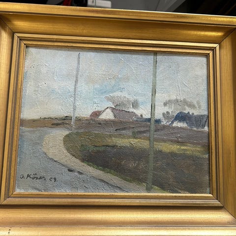 oliemaleri landskab med sø. Maleriet viser et naturmotiv med sø i forgrunden og træer i baggrunden under en overskyet himmel. Det er udført i olie på lærred i dæmpede, naturlige farver og indrammet i en klassisk ramme. Signatur ses i nederste hjørne af maleriet.