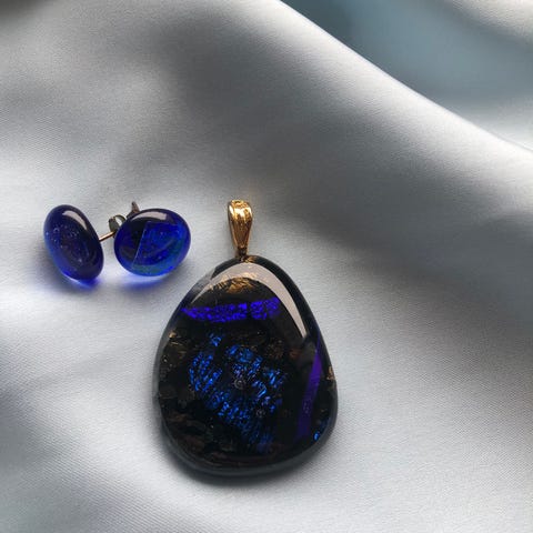 2 stk. ubrugte smykkesæt bestående af halskæde og øreringe fremstillet i glas i unikke farvemønstre. Halskæden har en stor vedhæng med en blød tekstilrem, mens øreringene matcher vedhængets farver og form.