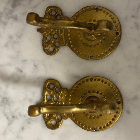 Gammel pakke med 14 kroge (messing belagte kroge?) eller knager til den minimalistiske stil. Med messing søm som også er fine som knager.