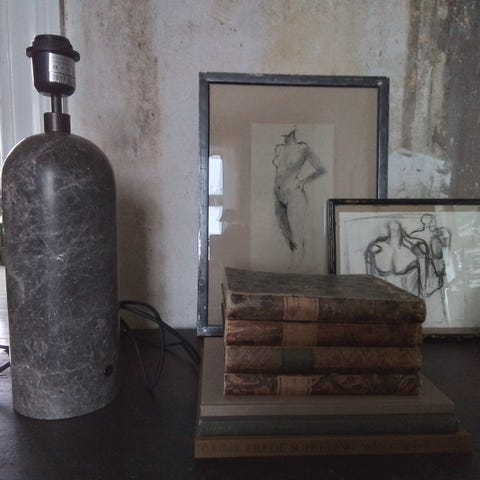 - Materialer: Marmor (fod), tekstil (skærm), metal (stander)