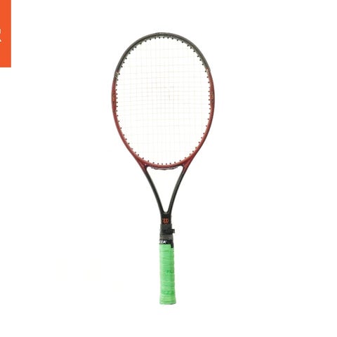 Tennis ketcher med rød og sort ramme samt et stort 'W' design på strengene. Ketcheren har en slidt grip og måler 70x28,5 cm. Velegnet til tennisudøvere og sportsentusiaster.