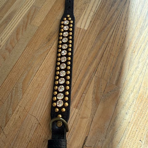 Hundehalsbåndet er i læder og har en enkelt lukning og er justerbart. Størrelsen på halsbåndet er 11,5 cm. Det er designet til at give et stilfuldt og edgy udtryk.