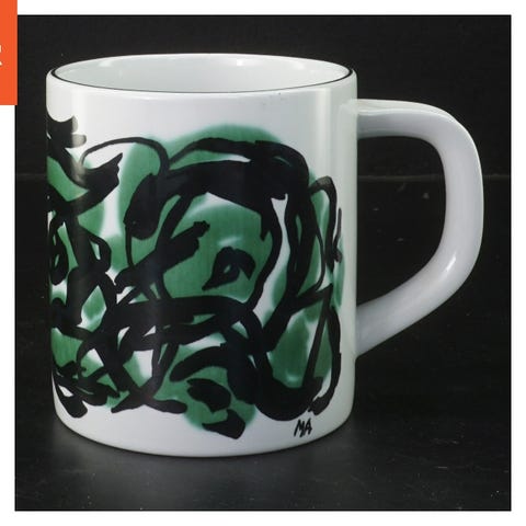 Et porcelænskrus med et unikt kunstnerisk design, hvor tallet 1985 er tydeligt påtrykt. Kruset har en dekorativ blå og sort penselstrøgsmønster og en klassisk hank. Bunden har en synlig stempel og nummerering.