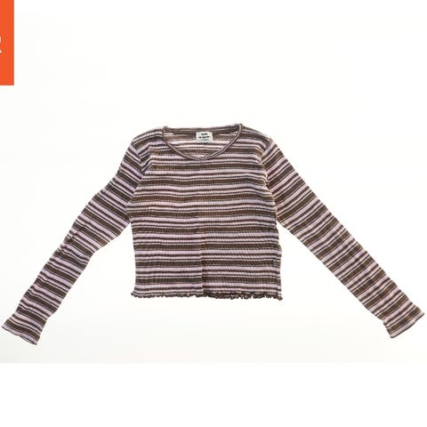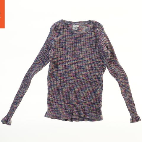 En langærmet bluse med striber i forskellige farver. Blusen har en rund halsudskæring og er lavet med en ribbet struktur. Designet består af skiftende striber i nuancer som lilla, blå og sort.