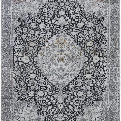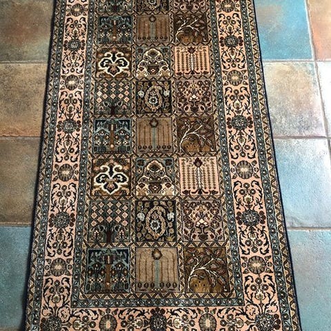 Eksklusivt og meget fint vintage silketæppe fra Kashmir, håndknudet, oprindeligt fra Indien, med certifikat for ægthed.
