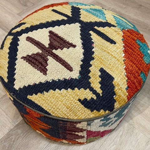 Denne autentiske puf/stol/sofa er lavet af 100% håndvævet Kelim, og benene er af træ. Meget ideel til din stue, soveværelse eller køkken. (Kelim er håndvævede tæpper af uld og bomuld)