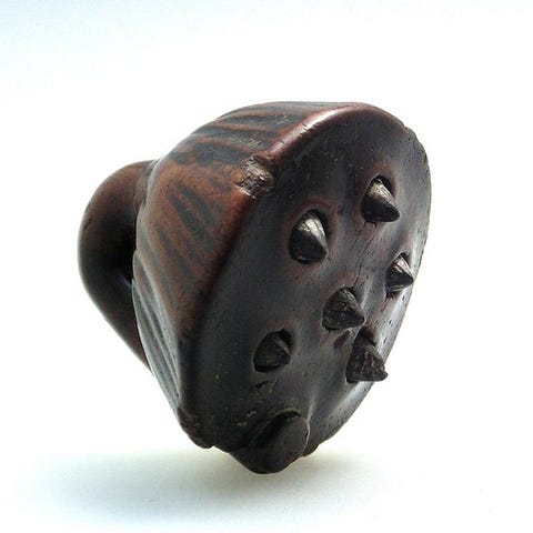 I denne type Netsuke, hvor Himotoshi ikke er til stede, blev snoren traditionelt fastgjort omkring midten af udskæringen.