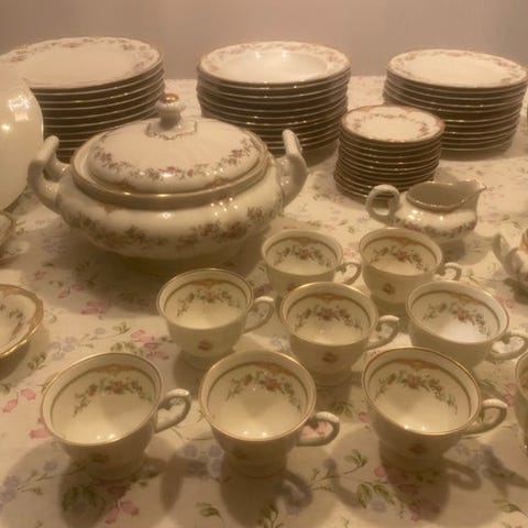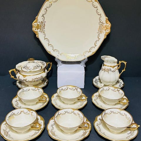 SCHUMANN ARZBERG - Bayern, Tyskland -- Servicestel med matchende tilbehør -- I fin tysk porcelæn i ren hvid, dekoreret med detaljeret blomsterdesign i blå Florale stil, romantisk mønster i forskellige blå nuancer fremhæver rigt kant i Meissen-lignende broderi i relief med blomster- og gittermotiver i Empire-stil, i fremragende stand, uden skader!