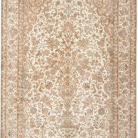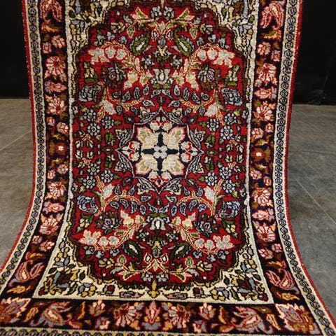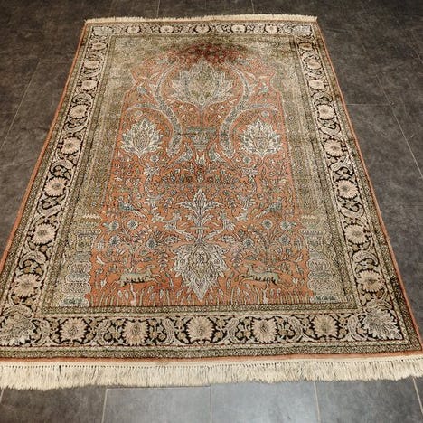 Kaschmir Silk tæppe fra Indien, størrelse 186 × 126 cm, uld på silke, i meget god stand og professionelt rengjort. Klik på den blå "gå til varen" knap, for at købe eller byde på denne vare. Den samlede pris vil blive vist inden du afgiver dit bud.