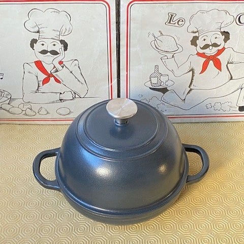 - Dimensioner af fondue-bourguignonne-servicen bestående af en emaljeret støbejernsgryde på en sort støbejernsfyr.
