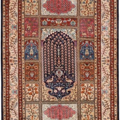 Turkisk Hereke-tæppe, model Pure Luxury 10/10 Quality, 88×62 cm, silke på silke, ét stykke, midt i det 20. århundrede, i meget god stand, professionelt rengjort, underskrevet som Semi-Antique Silk Hereke med omkring 1.000.000 knuder/m². Klik på den blå "gå til varen" knap, for at købe eller byde på denne vare. Den samlede pris vil blive vist inden du afgiver dit bud.