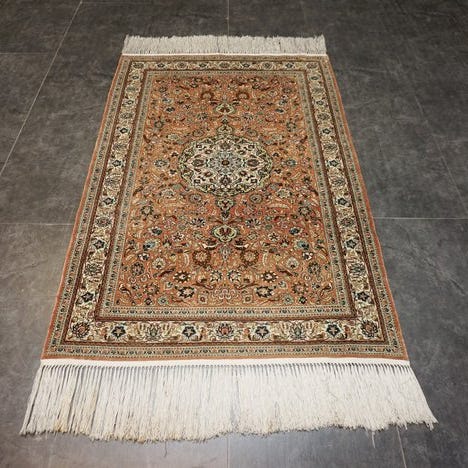 Oprindelse Kina; Model Gohm Seide; håndknyttet silketæppe, 144 cm x 103 cm, i meget god stand. Klik på den blå "gå til varen" knap, for at købe eller byde på denne vare. Den samlede pris vil blive vist inden du afgiver dit bud.