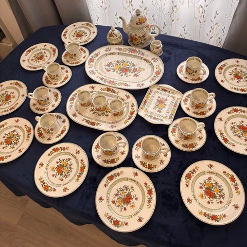 Dette er Filetto-kollektionen, fremstillet af høj kvalitet knogleporcelæn. Dette særlige service er en specialudgave til fejring af den 175-års jubilæum (1809–1984) for Faiencerie Mettlach-fabrikken, som det fremgår af det officielle mærke på bagsiden.