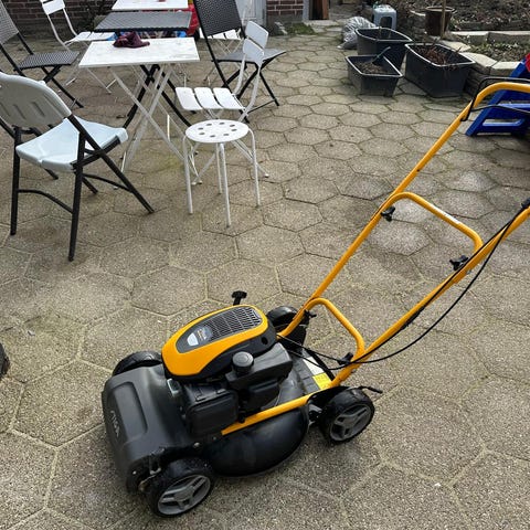 Alu skjold så ingen rust, bioklip, 48 cm klippebredde, b/s motor, service med nyt olie, kniv osv, starter, kører og klipper fint, samme kvalitet som en klippo