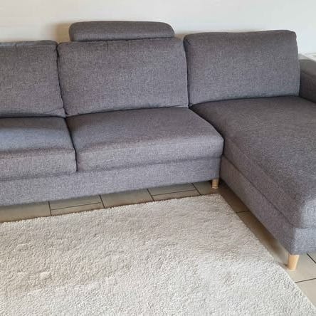 Sofa med dobbelt chaiselong, dobbelt mellemstykke, 2 nakkepuder og olierede ben af egetræ. Står i super velholdt stand uden skader