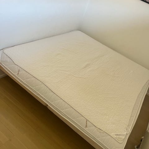 Dobbeltseng med træramme og madras. Gratis ved afhentning. Gives væk pga flytning.
