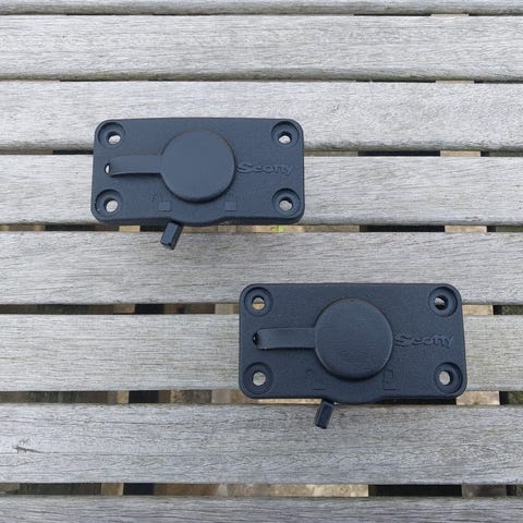 4 stk. Scotty 476 Rocket Launcher stangholdere med 4 stk Scotty 287 beslag til søgelænder (Ø22-Ø30mm). Kan slibes op i diameter fra de nuværende Ø22mm. Har været monteret, men aldrig brugt. Se billeder.