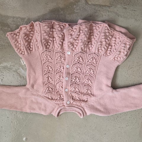 Cardiganen har det flotteste mønster og flæsekant ved hver skulder og håndled.