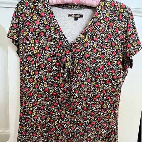 King Louie T-shirt til dame i størrelse XL. T-shirten er sort og fremstillet i viskose og bomuld. Den har kortærmet design med rund hals og et mønstret, strikket strukturlook i stoffet. Velegnet som hverdagstøj eller til mere afslappede anledninger.