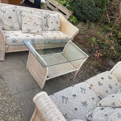 Rattan loungesæt bestående af flere loungestole og et rundt sofabord. Stolene har ramme i naturfarvet rattan med flettet side- og rygparti samt løse hynder i mønstret tekstil. Sofabordet har rattanstel i samme naturfarve og rund glasplade med underhylde i rattan. Sættet er egnet til udestue, havestue eller andre opholdsrum, hvor der ønskes lette møbler i naturmateriale.