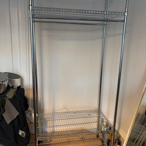 Tøjstativ fra IKEA som ikke kan købes mere, med plads til massere af tøj på stativ og kasse opbevaring.