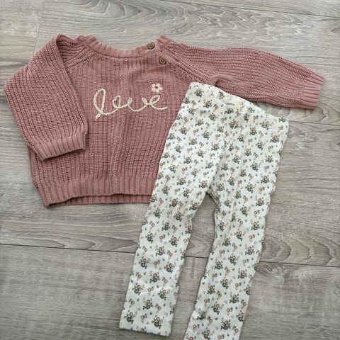 Sættet består af body og leggings i det sødeste pointelle mønster ligesom, at bodyen har flæsekant rundt om halsen.